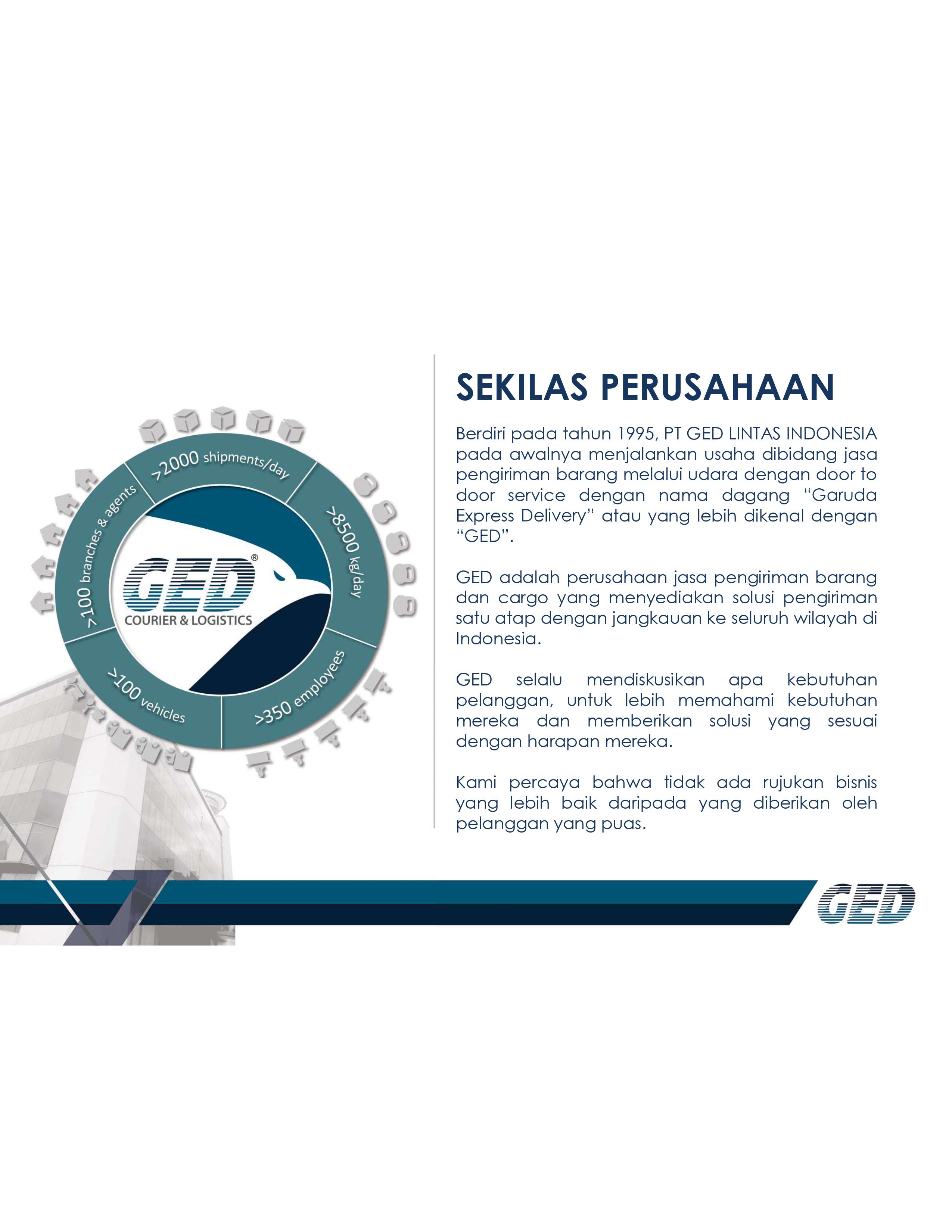 GED stands for GARUDA EXPRESS DELIVERY, established in 1998 with the founders of Garuda Indonesia Airlines commissioners and PT. GED Lintas Indonesia. In the beginning, GED support courier and cargo for Garuda Indonesia Airlines with the connection flight of Garuda Indonesia Airlines, GED has a vision to become a leading company in couriers, cargo and logistics Industry.Over 5 years GED in business, PT. Intra Asia Corporation acquired GED, PT. Intra Asia Corporation is a holding company that have business in airlines, insurance, Securities and many other business that support the holding company and GED continued its extraordinary growth in terms of revenue, improved its services and applied the state of art information technology after the acquisition.With the capabilities in nationwide networks GED has improved its network by more than 100 destinations nationwide and goes to international networks and their fleet capabilities also added more fleet in their expansion.